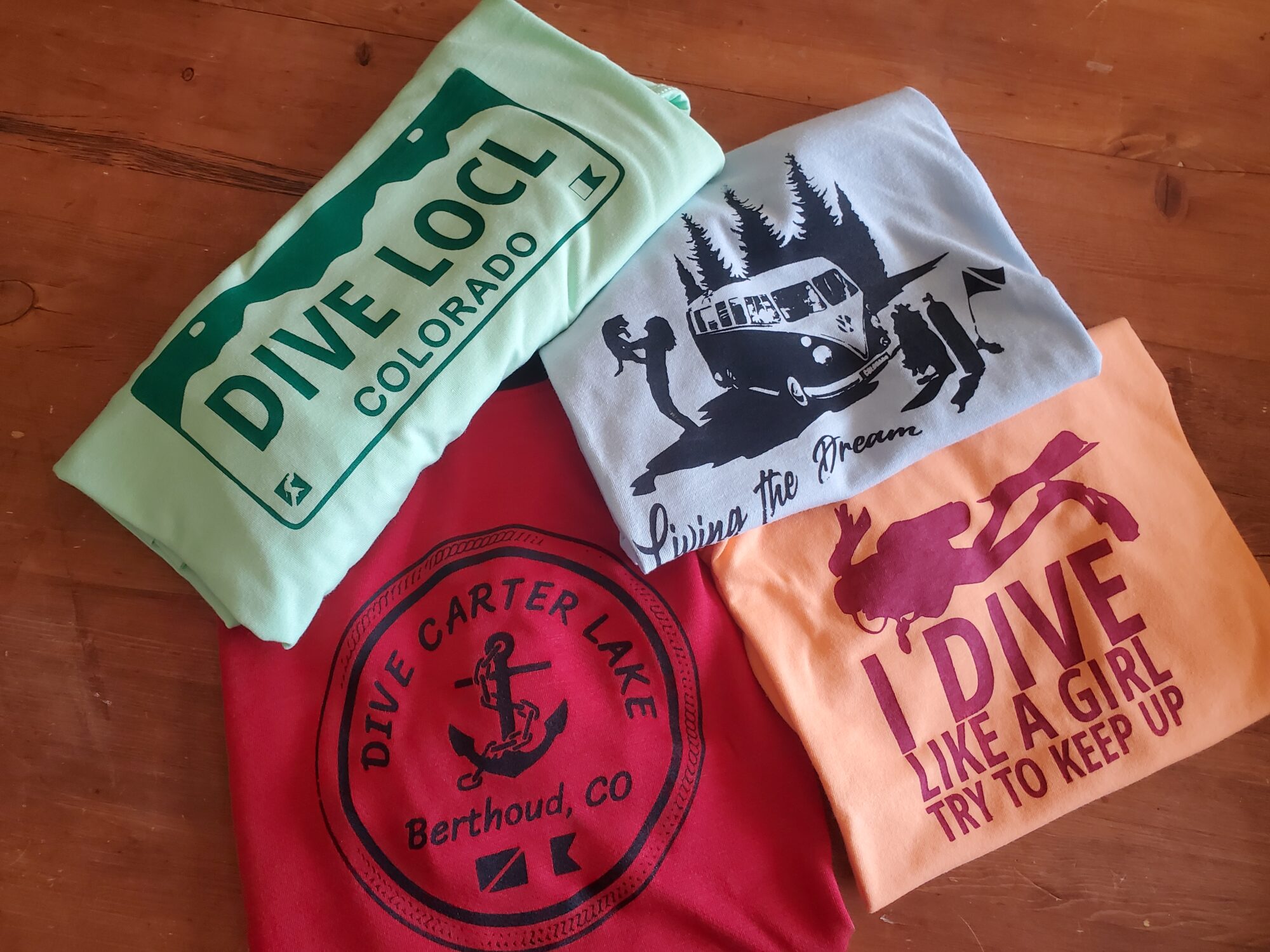 Classic designs for local Colorado divers. Townies? Lake divers? Drysuit divers? These shirts are for you. Celebrate scuba diving in Colorado with