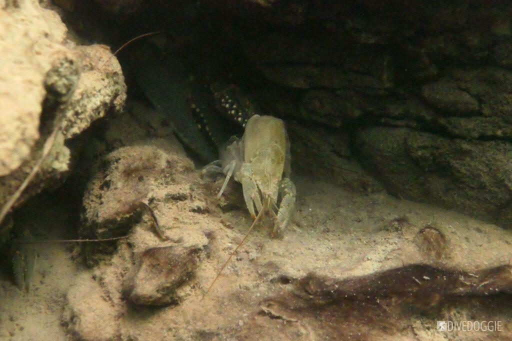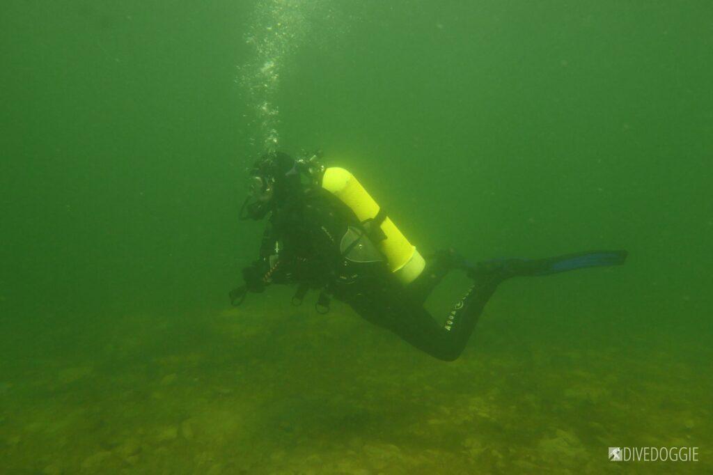 The first thing you’ll notice as you enter the water is the hum of the dam’s turbines. The closer you swim to the dam, the louder it gets and the more you can feel it in your chest. The “cliff” drops off to about 400′ at high water, providing what appears to feel like an “endless bottom”. Around 30-50 feet, you may encounter an old dock system that has sunken, given the appearance of a broken down log cabin. There is a large pipe protruding out of the wall as well. At 70 feet, it looks like dusk, at 100 feet, it’s nearly pitch black. Fish are only above the thermocline.